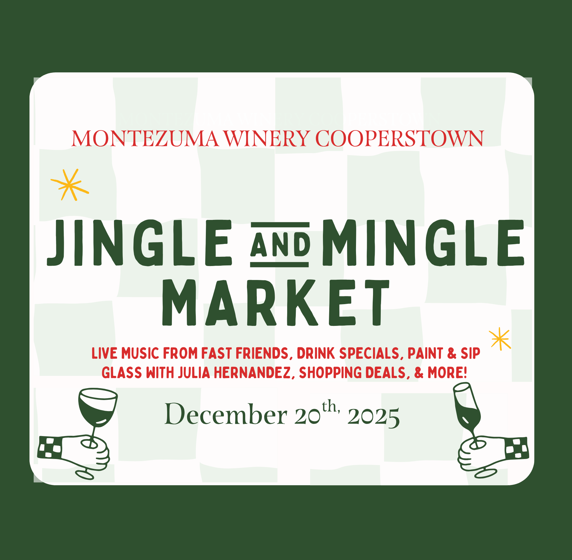 Paint & Sip (11:00 AM – 12:00 PM): Start your day with our Holiday Wine Glass class guided by our friend, Julia Hernandez. Paint your own stemless wine glass to give as a gift or sip on your holiday favorites in it!
