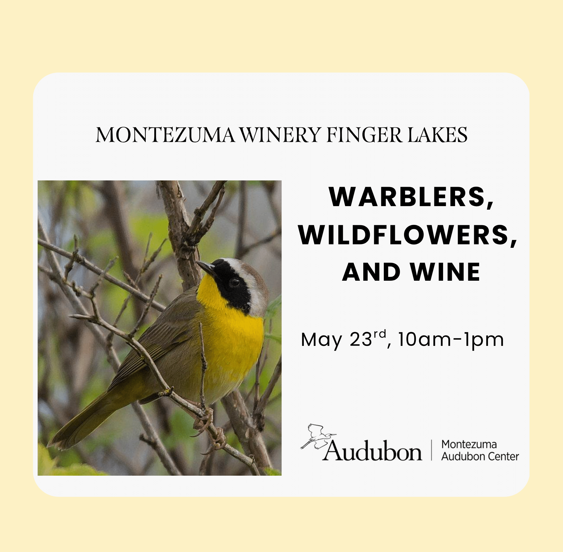 Embrace the Spring Season with the Montezuma Audubon Center and Montezuma Winery & Hidden Marsh Distillery! Join an Audubon educator for a guided walk along the U.S. Fish & Wildlife South Spring Pool Trail to welcome our warblers back from their southern migration. After our guided excursion, continue the fun at Montezuma Winery & Hidden Marsh Distillery for a wine and snack pairing flight! While you sample your wine and have a bite to eat, Daena Ford from Braddock Bay Raptor Research will bring out her raptor ambassadors for a live and up-close encounter.